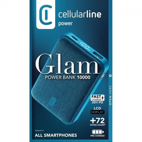 The GLAM PD 10000 is the 10000mAh portable charger that provides up to 72 hours of extra charge for your smartphone. Equipped with 3 ports: a USB-C with 18W Power Delivery input and 20W output, a second USB-C output port with 18W, and a USB-A output port with 18W, it allows you to charge up to three devices simultaneously quickly and efficiently. The convenient LCD display lets you easily monitor the remaining charge status of the power bank. The elegant design, featuring a fabric cover and dual premium finishes, offers a touch of sophistication and practicality. The GLAM PD 10000 is the ideal solution for those seeking a powerful, elegant, and functional power bank, perfect to accompany you through the busiest days.