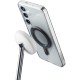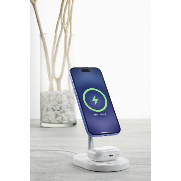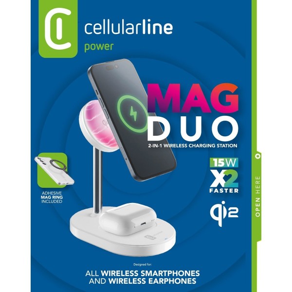 MAG DUO is the magnetic wireless charging station designed to charge smartphones and wireless earbuds simultaneously. With Qi2 certification, it offers fast charging up to 15W for compatible smartphones, ensuring precise magnetic alignment, safety, and efficiency. The magnetic pad allows the smartphone to be placed both vertically and horizontally, while the base includes a dedicated area to charge wireless earbuds with a maximum output of 5W.