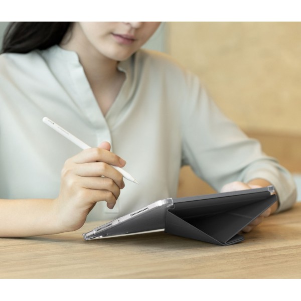 Ultra-slim and lightweight design featuring Y-fold functionality with three viewing orientations: landscape, portrait, and typing. Enhanced pencil slot for easy access and simultaneous charging of the Apple Pencil or Pixo Stylus. It features a sleek leatherette exterior, reinforced PC corners, and a frosted back, enhancing both form and function with added style.