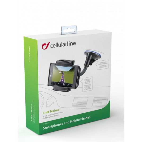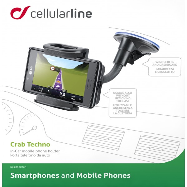 Big Crab Dualfix is an adjustable, universal device designed to mount portable devices such as mobile phones, smartphones and GP S navigators in the car. The independent, rotating feet are easily arranged to grip the device without obstructing any contacts or connections. The servo-assisted fin mechanism allows the device to be removed in total safety.The rotating head is used to position smartphones, phones and navigators with horizontal displays or widescreens, while the padded gripping surfaces guarantee stability without leaving any scratches or marks.