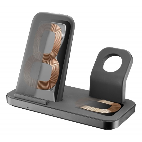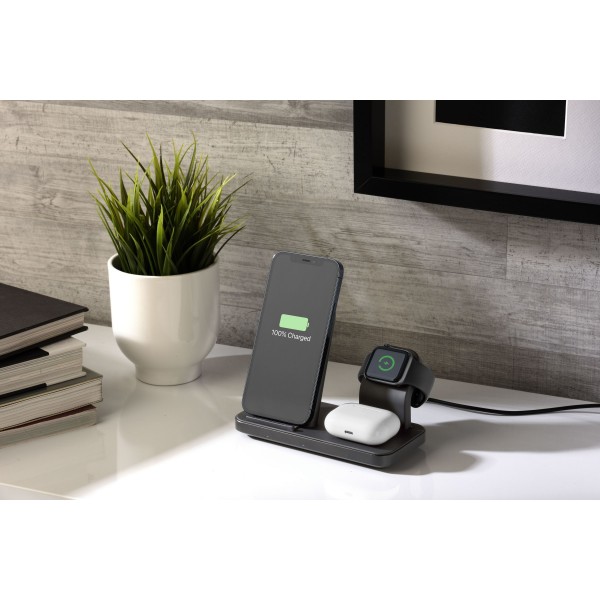 TRIO CHARGEUR SANS FIL est une solution 3-en-1 qui permet de recharger simultanément plusieurs appareils Apple, en éliminant les inconvénients des câbles.Trio intègre en effet un socle de charge pour iPhone et un pour Airpods, il dispose également d'un compartiment spécialement conçu pour accueillir le câble de charge original de l'Apple Watch.Pour garantir une recharge rapide de tous les appareils, le pack Trio chargeur sans fil contient également un chargeur USB-C de 20 W.
