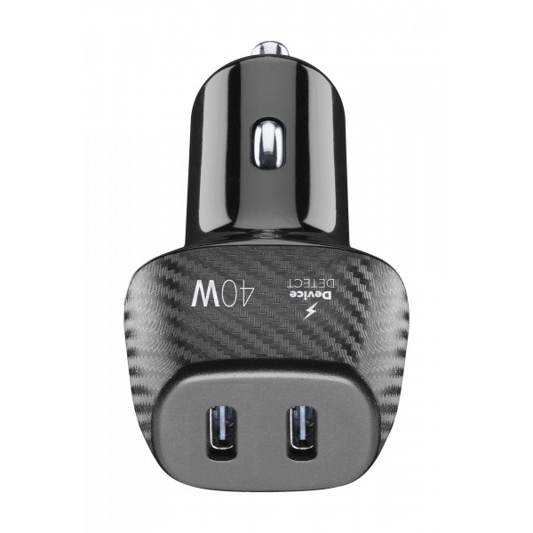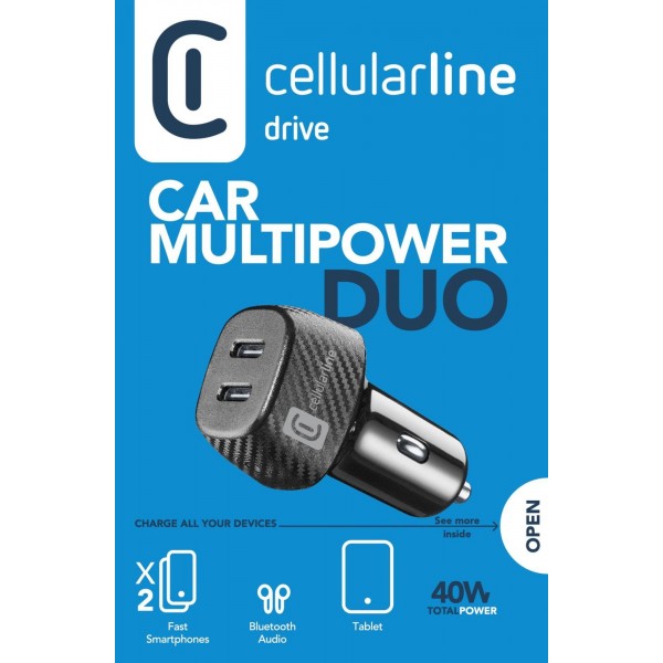 Car Multipower DUO est un chargeur de voiture doté de deux ports USB-C. Chaque port est équipé de la technologie POWER DELIVERY 20W qui, même en cas d'utilisation simultanée, délivre 20W chacun. La sortie maximale du chargeur est de 40W. Le Car Multipower DUO de Cellularline charge en toute sécurité n'importe quel appareil grâce à un circuit de protection contre les surcharges et les courts-circuits.