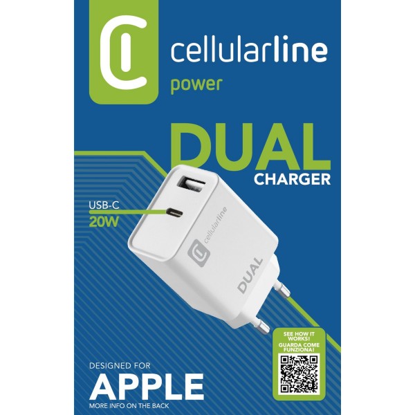 DUAL CHARGER est le chargeur secteur qui offre la solution parfaite pour charger deux appareils Apple en même temps, en vous permettant d'utiliser soit le câble USB-C vers Lightning contenu dans le pack des nouveaux iPhones, soit des câbles USB. S'il est utilisé individuellement, le port USB-C de 20 W offre une vitesse de charge maximale pour l'iPhone. Lorsque les deux ports sont utilisés en même temps, le chargeur réduit la puissance maximale fournie à un total de 15 W pour garantir une charge en toute sécurité.