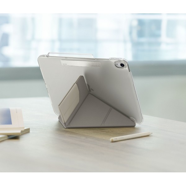 Design ultrafin et léger doté de la fonctionnalité de pliage en Y avec trois orientations de visualisation : paysage, portrait et saisie. Emplacement pour crayon amélioré pour un accès facile et une recharge simultanée de l'Apple Pencil ou du stylet Pixo. Il est doté d'un extérieur élégant en similicuir, de coins en PC renforcés et d'un dos givré, améliorant à la fois la forme et la fonction avec un style supplémentaire.