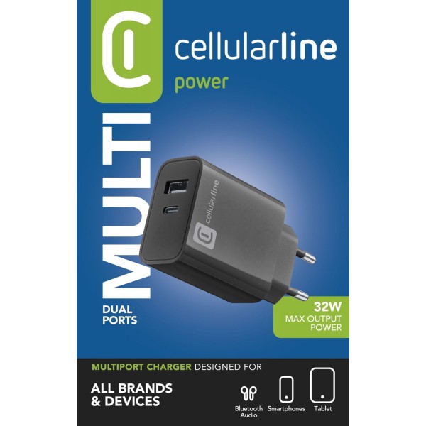 MULTIPOWER PD 32W is de oplader van Cellularline met 2 oplaadpoorten: 1 USB-C poort en 1 USB-A poort. Hiermee kunnen twee apparaten tegelijk worden opgeladen met slechts één stopcontact en hij is uitgerust met de innovatieve Device Detect-technologie, die het aangesloten apparaat herkent en veilig de juiste lading levert. De twee poorten ondersteunen 20W voor de USB-C poort en 12W voor de USB-A poort, voor een totaal van 32W vermogen.